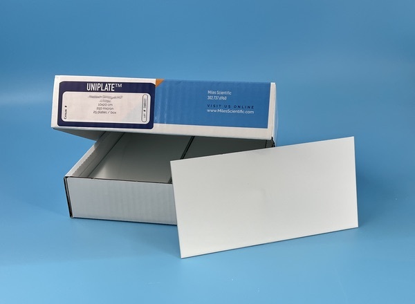 These plates are 100% water (H2O) resistant and are compatible with aqueous developing solvents. They are slightly less rugged than our plates with organic binder (HL/HLF) but still provide improved handling and sample application compared to classic, soft-layer, Silica Gel G/GF UNIPLATES and are tough enough to write on with a soft pencil. Hard Layer UNIPLATES with inorganic binder are recommended for all applications including those where visualization occurs through strong charring procedures or in application where an organic binder may not be desired.